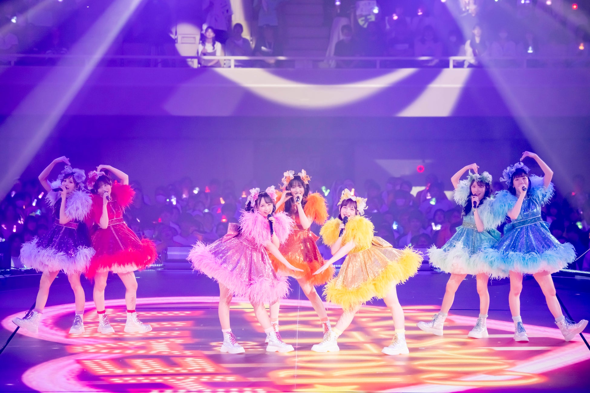 MCではメンバーが全方向にいるファンに声出しを呼びかけ、会場全体が一体感に包まれる。続く『ふれふるサマー!』では昇降リフトに乗ってファンの近くまでメンバーがやって来てタオルを思いっきり振り回す。ファンとメンバーが一心同体となって作り出すステージは、一足早い夏の訪れを感じさせるようだった。この勢いのまま『ずっと、ずっと、ずっと!』『CO-個性』『完璧主義で☆』でさらに会場を盛り上げると、キラキラと輝くスカートが印象的な新衣装でメンバーがステージに立つ。この衣装は『NEW KAWAII』のプリセンス衣装と同じく相澤樹氏と齋藤ヒロスミ氏が手掛けたもので、これまでの衣装とはまた違う可愛さを持つ“NEW KAWAII”仕上がりとなっている。そんな新衣装でさらに輝いた7人は『ぴゅあいんざわーるど』『RADIO GALAXY』『Going!』『ハートのローラーコースター』を披露し、圧倒的存在感を見せつけた。
