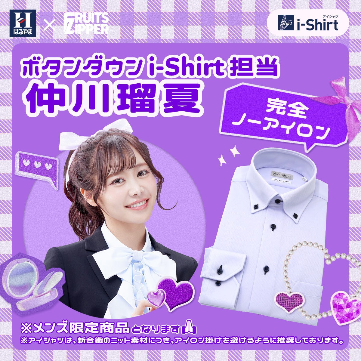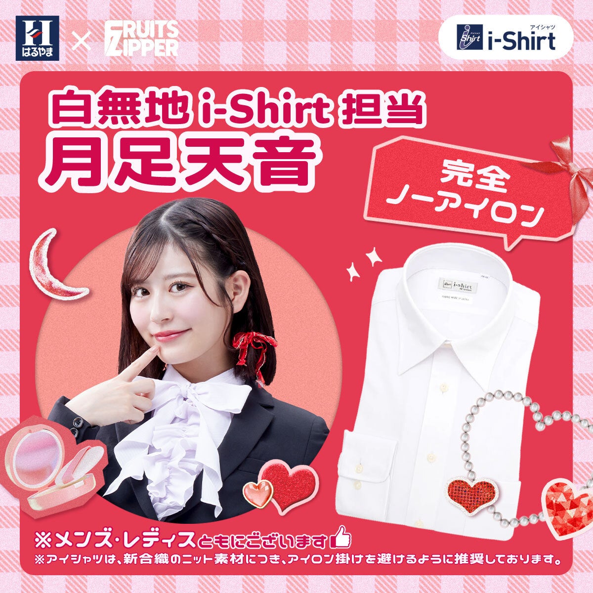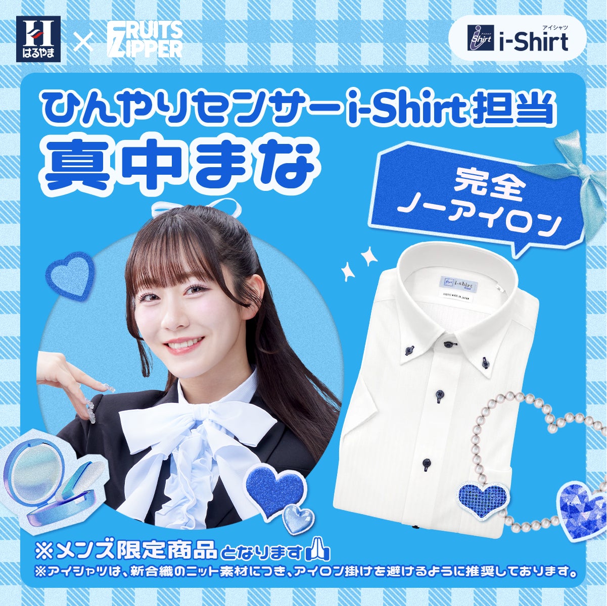 2025年3月14日から、FRUITS ZIPPERのメンバー7人がそれぞれ担当するアイシャツの特徴や魅力について、はるやま公式インスタグラムアカウントやX公式アカウントで発信しています。アイシャツの7つの魅力を、FRUITS ZIPPERらしい形で紹介することで、完全ノーアイロンはもちろん、それ以外の「ヨイトコロ」を知っていただける企画です。