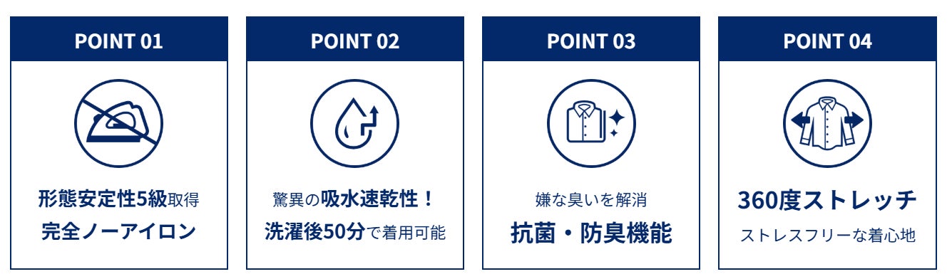 「i-Shirt」は、シワになりにくくアイロン掛け不要の「完全ノーアイロン*1」で、夜にお洗濯をして翌朝には着用できる「吸水速乾機能」、部屋干しに対応した「抗菌防臭機能」、ニット素材を採用した高いストレッチ性によるスポーツウェアのような着心地を兼備しています。時短&簡単ケアとルームウェアのような楽な着心地で仕事もプライベートも充実させるビジネスパーソンのライフスタイルをサポートします。