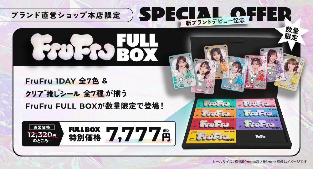 更に、ブランド直営candy magic公式ショップ本店限定で、<数量限定>FruFru FULL BOX(フルフル フルボックス)を発売いたします。FruFru全7色各1箱と、『クリア“推し”シール』全7種全てをセットにし、専用BOXに入れてお届けします。