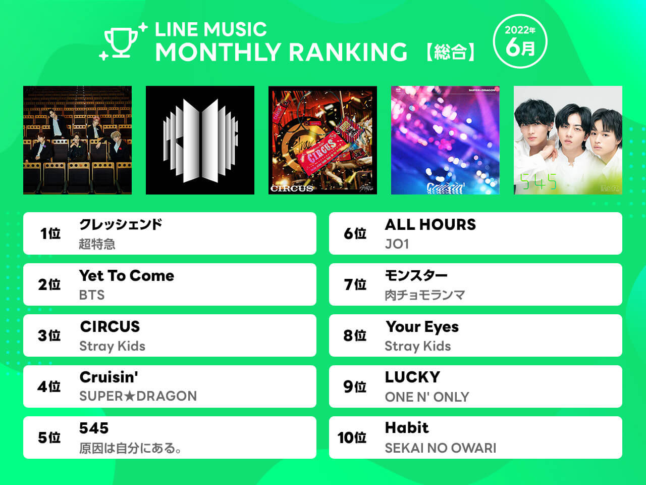 【2022年6月LINE MUSIC 月間ランキング 】1位 超特急「クレッシェンド」、2位 BTS「Yet To Come」、3位 Stray Kids「CIRCUS」!