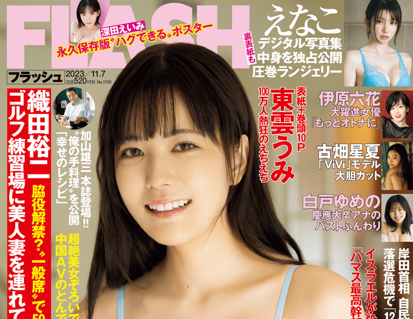 Gカップ&100cmヒップ・東雲うみが初表紙&巻頭グラビア!美ボディ・白戸ゆめのアナ、朝ドラ『ブキウギ』で話題・伊原六花、ミス東大2023ファイナリストも掲載のFLASHは、10月24日(火)発売